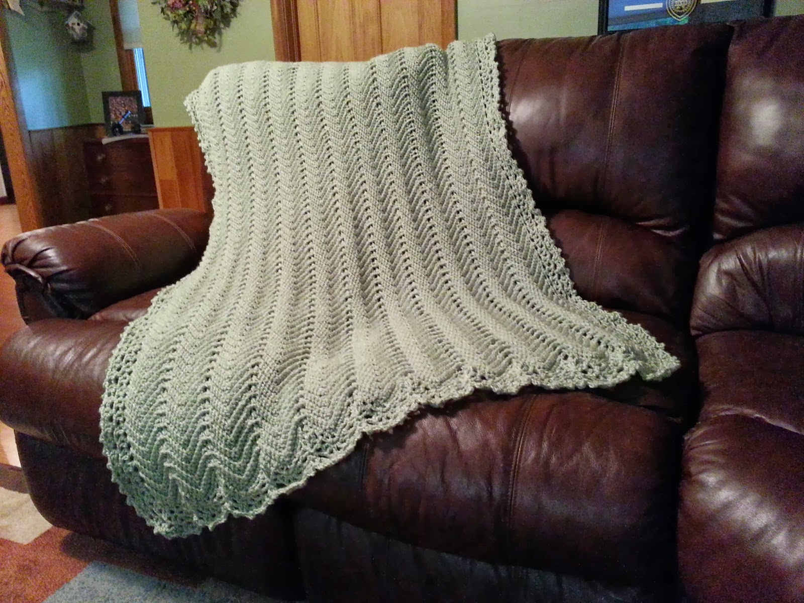 I started to make an afghan last year for my mother for Mother's Day. I got side tracked, a lot, and finally finished it for her this year. I was very happy with how it turned out. I think it's really pretty. It's made from Lion Brand Vanna's Choice yarn and the color is Seaspray Mist. I probably wouldn't have chosen this yarn for myself because it feels a bit scratchy and is a tiny bit fuzzy. However, my mom loves it. The colors in this yarn are very very pretty. The body of the afghan was very easy because I've made rippled afghans before. The lace edging took several attempts before I could get the hang of it. However, it was worth it because I think the pattern is beautiful! I used the pattern from "Afghans For All Seansons Book 2" by Leisure Arts. Now I have to decide what to work on next. I think I'm going to try my hand at knitting a lace shawl. This could take another year to complete!